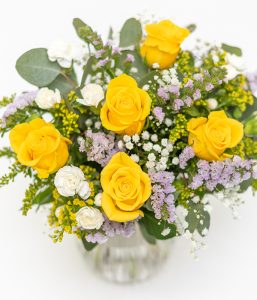 A beautiful bouquet filled with yellow roses and white spray carnations accompanied by solidaster, and statice with fresh foliage. Sent via a tracked courier service in a protective Eflorist box, the bouquet will arrive safe and secure ready for the recipient. Your fresh flowers will arrive in bud, ready to transform in front of your lucky recipient within 48 hours from delivery. Top quality flowers that are surprisingly well priced.