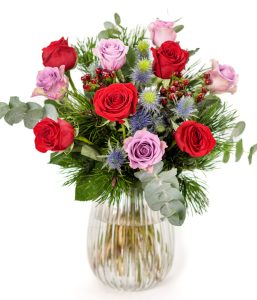 This elegant Christmas bouquet brings together beautiful premium roses, pine, eucalyptus, blue eryngium, and hypericum in magical cherry tones, creating a festive arrangement full of warmth and sophistication. Delivered in bud for long-lasting beauty, this bouquet allows you to experience the joy of blossoms unfolding at home. Sent in a special Eflorist box to protect the stems in transit. With tracked delivery, you can follow your surprise every step of the way. The perfect Christmas gift that looks grand without breaking the bank.